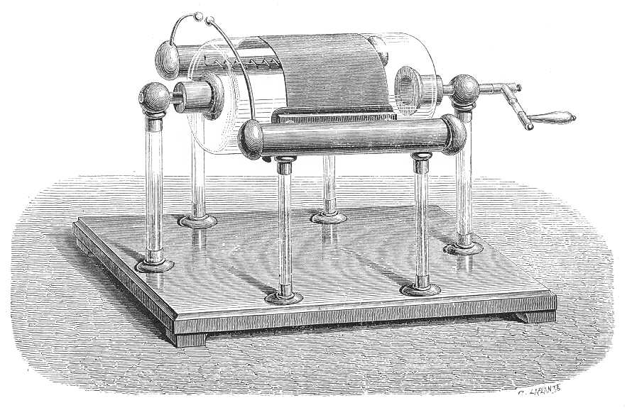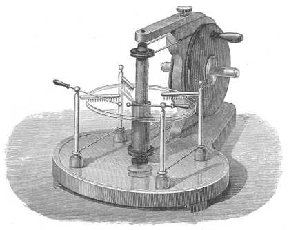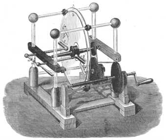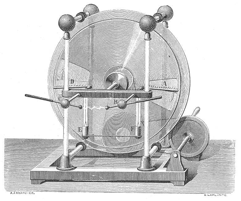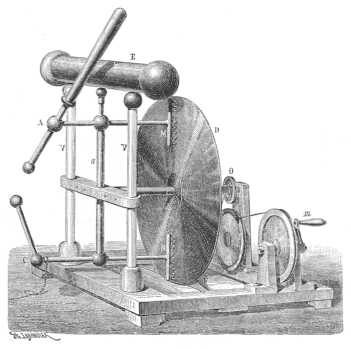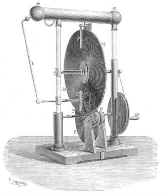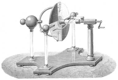 D ebonit-korong csiga- és kötélszerkezet közbenjárásával, mely egy forgattyú segélyével mozgásba hozható, vízszintes tengely körül forog. Eme korong alsó részével ugyanazon anyagból vágott szelet állíttatik szembe, mely kézzel vagy macskabőrrel való dörzsölés útján előre elek-