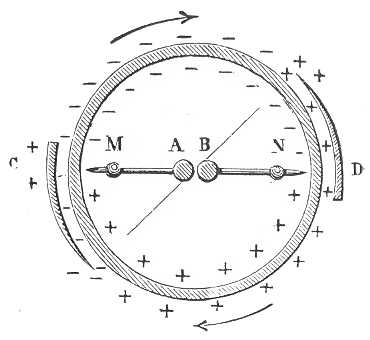 A C papirlap aljához macskabőrrel negativ elektromosra dörzsölt ebonit-lemezt közelítimk. A papir gerjesztés útján positiv elektromosságot vesz fel, mialatt a negativ elektromosság a nyelvecskén át a korongra, vagy ha úgy akarjuk, a hengerre ömlik, a mely mozgásban van. Az AB konduktor mely most folytonos, mivel a golyókat érintkezésben levőknk tételeztük fel szintén elektromos lesz influentia útján; az M fésűnek csúcsai positiv, az N fésű csúcsai pedig negativ elektromosságot bocsátanak ki az üvegre. A másik papir-fegyverzet, D, megosztást szenvedve az üveghengernek azon negativ elektromos részeitől, melyek a nyelvecskéje elé érkeznek, ennek csúcsán keresztül positiv elektromosságot önt az üvegre és alapján negativ elektromossággal telik meg. Ebből az következik, hogy az üveghenger külső és belső felületén megtöltődött és pedig egyik felében positiv, a másikon negatív elektromossággal. Ezen ellentett elektromosságok kölcsönös hatása a fegyverzetek és a fésük csúcsaiból kiömlő elektromosságok áramát növelik, s ha a levegőn vagy a tartókon át történő elszóródást nem vesszük tekintetbe, a felhalmozódás geometriai arányban megy végbe.
