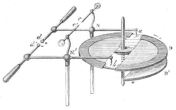E üvegkorong, kötél- és csigarendszerrel hajtva, függélyes tengely körül forog. Alsó felületére két körszelet alakú ónlemez van ragasztva, melyek a felső lapra CD szalagokban fel vannak hajlítva, s melyeket az átmérő mentén szabad köz választ el egymástól. A szigetelő lábakon megerősített két konduktor, NN', a korong fölé emelkedve, eddig nyúlik, s a gömböcskék, melyekben végződnek, a és b hajlékony kis rugókkal vannak ellátva, s ezek ellenkező oldalak felé görbülnek. Az üveg korong alatt a körszelvényekkel egyező alakú és méretű elszigetelt vezető, D' van mozdíthatatlanúl megerősítve és a gerjesztő szerepét játszsza. Tegyük fel, hogy positiv elektromossággal töltjük meg. Megosztás útján a D szelvényt és Na konduktort elektromozza, melyek addig, míg a rúgó az ónlemezt érinti, összefüggő vezetőt képeznek; a forgás azon pillanatában, mely az ábrában feltüntetett helyzetet kevéssel megelőzi, D negativ elektromossággal telik meg és N az ellentett végén positiv elektromossággal. Az a rúgót elhagyva, D szelvény a b rúgó útján N' konduktorral közlekedik s átadja neki negativ elektromosságát. Ámde a forgó mozgás most a második C szelvényt az előbbinek helyére viszi s így ezen van most a sor, hogy megosztás útján elektromossá váljék. Ez a hatás vég nélkül ismétlődik s a konduktorokon fölszedett elektromosság geometriai arányban növekszik, egész a maximális értékig, melynél a gép egyes alkatrészei között szikrák