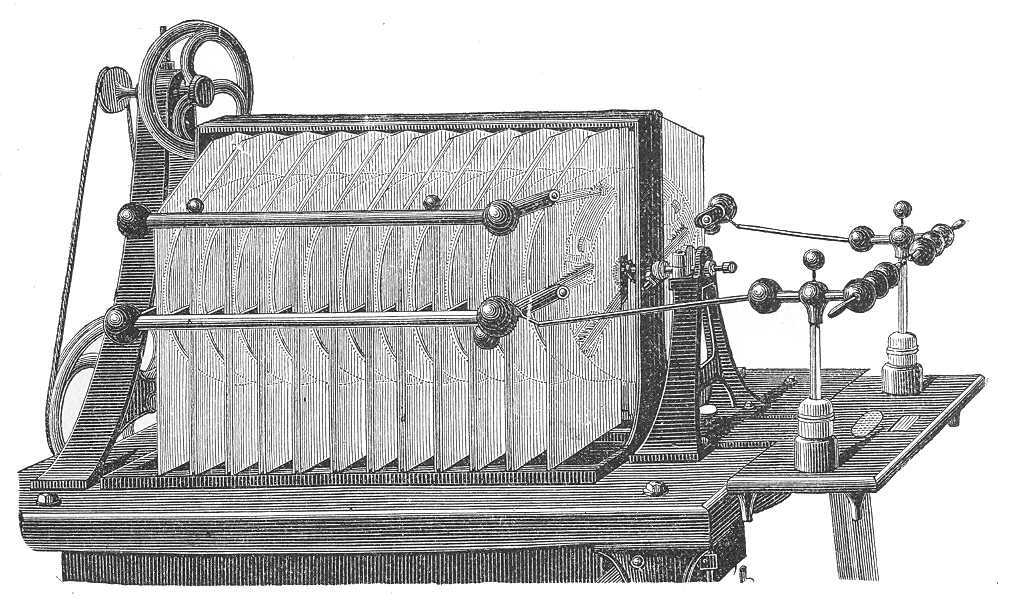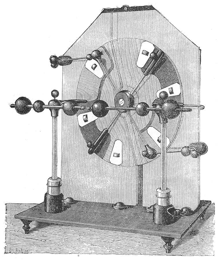 A párisi nemzetközi elektromos kiállításon a TOEPLER-féle gépet a leírt mintától eltérőleg többféle alakban lehetett látni. Ezek egyikét a 119. ábra mutatja, s a 120. ábrában ugyane fizikusnak egy másik gépe látható, mely az egyszerű gépet alkotó két korong helyett húsz korongnak egyesítéséből eredt. Ennek czélja az elektromosság fejlesztését s a gép elektromindító erejét ugyanazon arányban növelni.