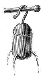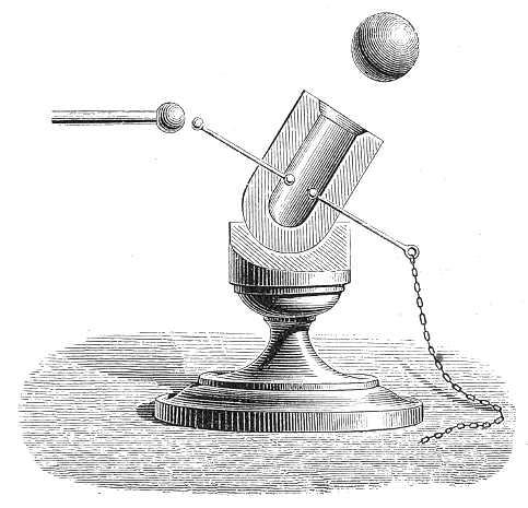 A hirtelen kiterjeszkedés, melyről beszéltünk, az elektromos mozsár kigondolására vezetett (131. ábra), melynek játékát a megelőzők nyomán könnyen meg lehet érteni. Azon pillanatban, melyben a szikra átugrik, a golyó ellöketik; a hatás még szembetünöbb, ha a kisérlet előtt néhány csepp ethert teszünk a mozsár fenekére, a melyet a meleg haladéktalanúl gőzzé alakit át.