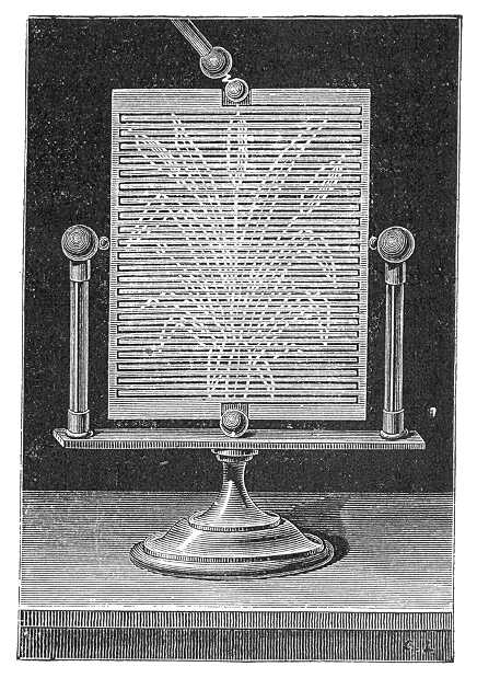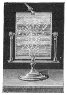 Egy négyszögletes üvegtáblára stanniol-szalagokat úgy ragasztva, hogy párhuzamos vonalakat alkossanak, a mint azt a 129. ábra mutatja, erre az alapra egy csúcs segélyével tetezőleges alakú rajzot rajzolhatunk.