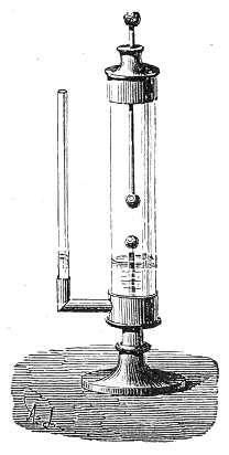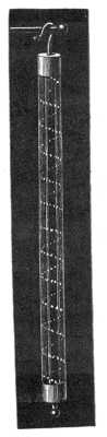 Két nem egyenlő átmérőjű közlekedő üvegcső, a nagyobbik teljesen elzárva, a kisebbik pedig fölül nyitva, kevés vízzel van megtöltve (130. ábra). A tágabb cső belsejében két golyóban végződő fémpálczika van, az egyik az alsó, másik pedig a felső alaphoz erősítve; az első a talajjal, a második pedig az elektromozó gép konduktorával közlekedik. Amint szikra ugrik át, a nyílt csőben a vizet hirtelen felszökni látjuk; ha a szikra igen erős, a víz kilöketik a csőből. A lökést a levegő molekuláinak heves rázkódása s a hőmérséklet emelkedése okozta feszítő erő együttesen idézi elő s nem pusztán az utóbb említett ok, amint azt a kisérlet felfedezője, KINNERSLEY kezdetben hitte. A levegőnek meleg okozta kiterjedését az bizonyítja, hogy a folyadék vízszintjét nem foglalja azonnal vissza. A készülék a Kinnersley hévmérője nevét viseli most is.