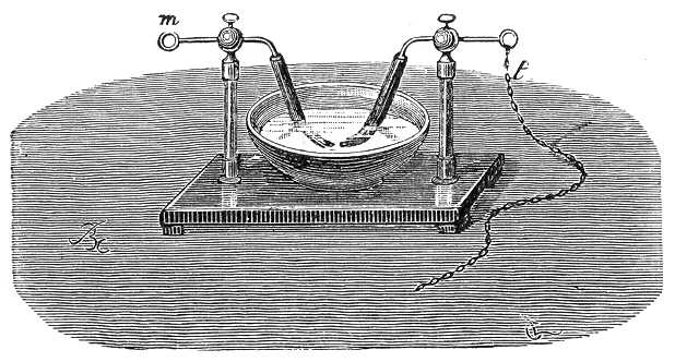 A szikrát át lehet vízen is csapatni. E végből a két vezető cső, egyikök m-nél a géppel, másiknak t-nél a földdel közlekedvén, gutta-percsa mezzel van borítva, hogy a víztől el legyenek szigetelve, s csak a két alsó végük, az edény fenekén szembe állítva, marad meztelenül.