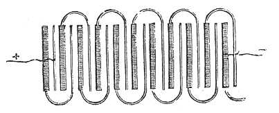 A MUNCKE-féle láncz ugyanazon előnyökkel dicsekszik, mint a WOLLASTON-féle; azonban kisebb tért foglal el, mivel mindegyik eleme nem kiván külön edényt. U alakban görbített czink- és réz-lemezek sorából van képezve, melyek egymást átölelik, úgy mint azt a 167. ábra mutatja, mely a lemezek vízirányos keresztmetszetét tünteti elő. Az egész alul és felül fa-keretbe van foglalva, melyet savanyított vízzel megtöltött teknőbe merítenek, ha az oszlopot működtetni kivánják. |