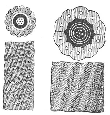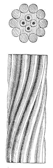 Nagyon fontos, hogy a drótok guttapercsa-burkolattal vétessenek körül; ezt az anyagot rendszerint négy rétegben rakják fel, úgy, hogy egész vastagsága 34 milliméter. A guttapercsa nemcsak hogy kitűnő szigetelő, hanem még a tengervízben is majdnem hogy változatlan marad. Kezdetben megelégedtek evvel a burkolattal, de nemsokára kiderült, hogy szükséges, hogy külsőleg megvédelmeztessék a rongálások ellen. Most tehát vastag kátrányos lajfántréteggel övezik körül s ezt a réteget spirálszerúleg összesodrott galvánozott vasdrótok sora tartja össze és óvja meg. A mellékelt ábrákban a különböző tengeralatti telegráfvonalokon jelenleg használatban levő kábelek egynémelyikét természetes nagyságban tüntetjük elő. Látni való, hogy ezek a mustrák különböző nagyságuak, de a gyártásuk módja körülbelül ugyanaz; mindazonáltal eleintén azt hitték, hogy egy kábelben több külön drótot lehet elhelyezni (419. ábra), hogy aztán a közlekedést sokszorosítaní lehessen. Ezt a módszert általában véve abbahagyták, mert felismerték a többszörös drótok rossz oldalait; valóban, a többszörös drótok jelentékeny térfogattal súlylyal járnak, mi a lerakás műveletét megnehezíti; de a legnagyobb baj az, hogy a drótok közelléte létrehoz gerjesztett áramokat, melyek a közlekedést zavarják. Ennélfogva, ha a közlekedés élénksége úgy hozza magával, a végállomások között inkább több kábelt raknak le,