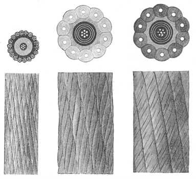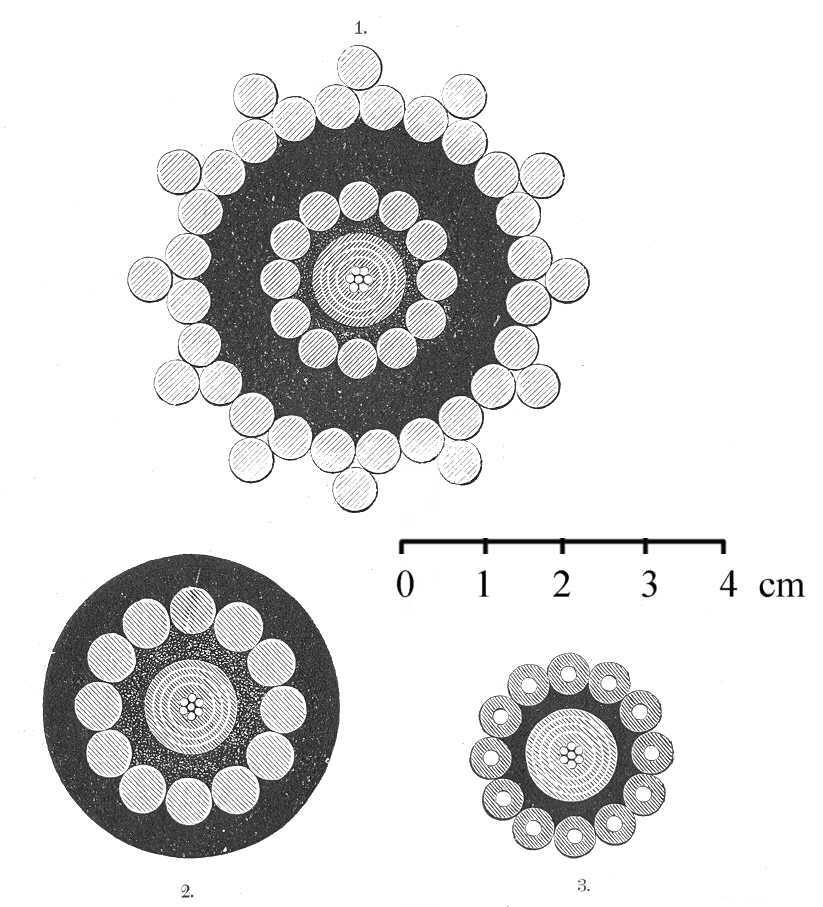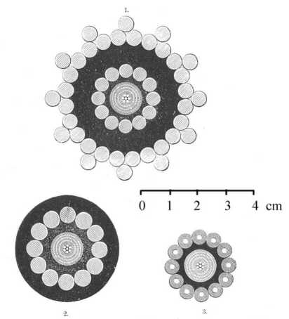 422. ábra. A Brest és Saint-Pierre közötti vonalnak 1867-ben lerakott kábele; 1 a parti kábelnek, 2 a közepes, 3 a nagy mélységekbe lerakott kábelnek átmetszete, természetes nagyságban.