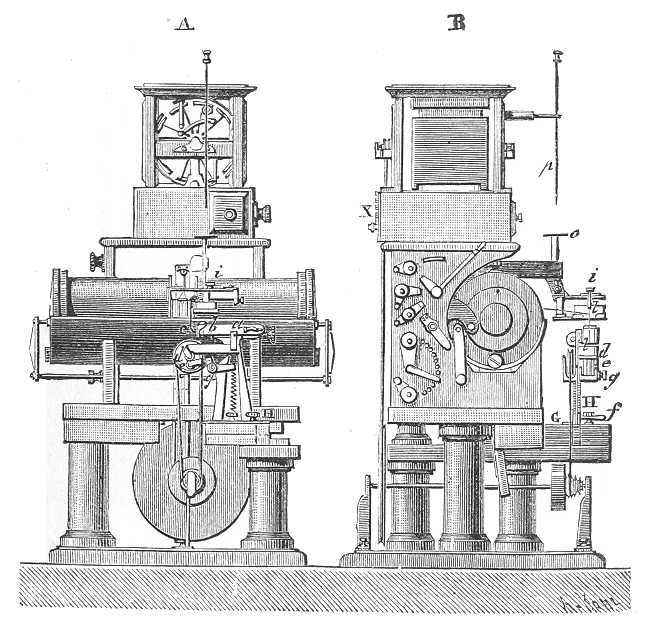 Eme nehézség elhárítása sikerült, s ugyancsak a tükrös galvanométer feltalálójának köszönhetjük azt a készüléket, mely siphon recorder név alatt (425. és 426. ábra), a galvánométer mulékony jeleit papiros-szalagra irt jelekké alakítja át, s így a sürgöny olvasását is és az ellenőrzését is lehetővé teszi.