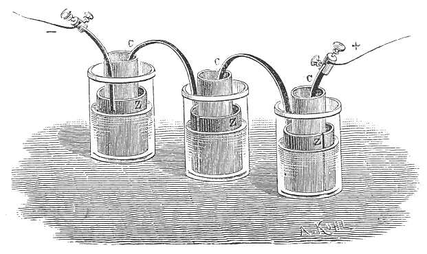 mind pedig a rézgálicz-oldatot tartalmazó likacsos edénybe folyadékot öntsünk, hogy így a párolgás okozta veszteséget helyrepótoljuk; továbbá arra kell ügyelni, hogy a diafragmába rakott gálicz-kristályok mindig elegendő mennyiségben legyenek jelen. Végre időről időre el kell távolítani az edényfalakra lerakodó kristályokat, s ki kell cserélni a czinklemezeket, midőn s foncsorozás megromlott. A DANIELL-elem áramának állandósága miatt a DANIELL-oszlop igen jó elektromótor; volt rá eset, hogy a páris-berlini, bizonyára hosszú és bizonyára élénk vonalon gondozás nélkül három hónapon át működött. Az 100, 200, 400 kilométernyi vonalakon alkalmazott DANIELL-elemek száma 30, 50 és 70.