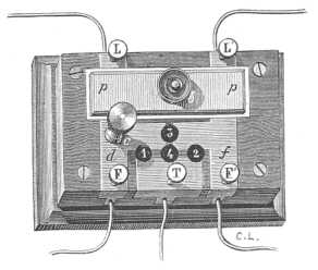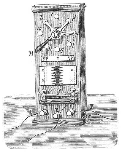 A 433. ábra a villámhárítónak másféle berendezését mutatja, mely szintén a csúcsok hatására s arra a különböző módra van alapítva, a melylyel az elektromosság magát viseli, a szerint, a mint volta-áramokból ered vagy a mint légköri zavarból származik. A kommutátor három érintkeztetővel van ellátva. Midőn a középső érintkeztető a d gombon van, miként az ábra is mutatja, az áram egyenest az állomásba megy, miről könnyen meggyőződhetünk, ha ama pontozott vonalak után indulunk, a melyek a készülék különböző részeinek elektromos összeköttetését jelölik meg. A vonaldrót L csavarától az áram a kommutátorba s innét az állomás E csavarába megy; az f dróton épenséggel nem megy keresztül. Vihar alkalmával s középső érintkeztetőt a b gombra fordítják s ekkor az áram, mielőtt az állomásra érkeznék, a csipkézett lapokon s az f dróton megy át. Végre midőn a vihar heves, a kommutátort a T betűvel (terre) szemközt állítják; középső érintkeztetője a c gombra szorul. Valamennyi elektromos áram közvetetlenül s földbe fut a nélkül, hogy bármiféle úton közlekedhetnék az állomás készülékeivel, melyek ily módon minden veszélytől meg vannak óva. |