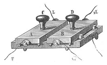 A BRÉGUET-féle villámhárító, melyet s 432. ábra tüntet elő, nagyon egyszerű. Lényegében véve két csipkézett fémlapból áll, mely lapok csipkéi egymással szemközt vannak; továbbá egy csőből, melyben egy igen vékony vasdrót van, mely drót az a és b csiptető-csavarokat elektromossn összeköti; végre a P áramváltóból. Midőn ez utóbbinak érintkeztetője az ábrában jelzett helyzetben van, a vonal árama L-től E felé, s innét az állomás készülékeibe jut. Az oszloptól eredő dinamikai elektromosságnak. nincs akkora feszültsége, hogy a csúcsokon szétszóródjék s a rendes útján