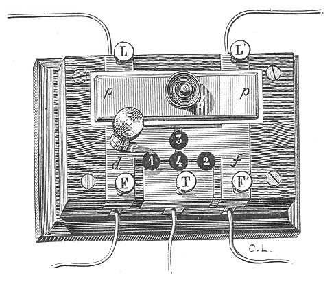A belga vonslakon elfogadott villámhárító (435. ábra) szintén fémlapokból, pp és df-ből áll; e lapok közé egy vékony, szigetelő papiroslap van téve. A jobb- és baloldali szomszédos állomások vonaldrótjai L és L'-hez érnek, az állomás készülékeinek drótjai pedig F és F'-hez; T a b gombbal s a földdel közlekedik. Az 1, 2, 3 és 4 lyukak, melyek a fém-lapok fa-alapzatába vannak fúrva, arra valók, hogy beléjük a c fémdugót lehessen dugni, mely dugó ekkor a villámhárító különböző részeit kapcsolja össze. Rendes időjárás alatt a dugó az ábrában megjelölt helyen marad: ekkor a szomszédos állomások a telegráf-hivatal készülékeivel közlekednek, s a közlekedésnek a két oldalon mi sem állja az útját. Midőn a vihart jobbról jelzik, a dugót a 2 lyukba illesztik; a légköri elektromosság a p lapon s a T dróton át a földben vész el. Midőn a zavart a baloldalon veszik észre, a dugót az 1 lyukba teszik. Végre midőn a vihar a két vonalat egyszerre fenyegeti, a dugót a 4 lyukba illesztik. A 3 lyuk arra való, hogy a két vonal között közvetetlen közlekedést lehessen létre-