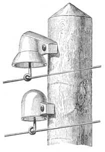 414. ábra. Telegráfvonalak a levegőben: felfüggesztő póznák, szigetelő harangok. |