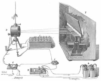 A 423. és 424. ábra előtünteti a franczia transatlanti kábelnek készülékeit, a miként a bresti állomáson vannak elhelyezve. Az első ábra a THOMSON-féle galvanométer keresztmetszete; a második ábra pedig valamennyi készülék elhelyezés-módját mutatja. A tekercs közepén látjuk a köralakú kicsiny tükröt, mely el van látva a mágnestűvel, melyet s galvanométer fölött levő függélyes rúdra függesztett E mágnes irányzatlanít. Egy selyemgubószál tartja a tükröt, melynek lengéseit meglassítja egy lapocska, mely maga is az egész rendszer alatt függ. C a készülék áramváltója; B a kétbillentyűs jeladó, mely hasonlít s MORSE-féle jeladóhoz, s mely váltakozva a pozitív s a negatív áramokat szökkenti: a negatív áramok nak a tű és tükör balfelé való kitérései felelnek meg, holott a pozitiv áramok a tűt jobbra térítik ki. F egy sötét kamra, mely magában foglalja azt a skálát, melyen a hátúl levő lámpa képei keletkeznek. A fénynyaláb a kamarának egy ernyőjébe vésett résén hatol át, ezután az R úton haladva a tükörre esik s innét, midőn a tükör mozdulatlan, R' felé a skála zérus-pontjára verődik vissza. Valahányszor a kábel áttette áram kering,