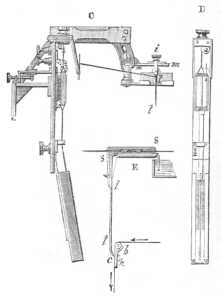 Szóljunk most a csengetyűkről, melyeknek szerepét már akkor, midőn a telegráf-készülékeket írtuk le, jeleztük, a nélkül azonban, hogy mozgató gépezetük bármelyik részletére kiterjeszkedtünk volna. A csengetyűrendszerek száma legalább is akkora, mint maguké a telegráf-készülékeké. Elég lesz, ha eme rendszerek egy-kettejét magyarázzuk meg. A legegyszerűbb s a franczia telegráfvonalakon leginkább elterjedt csengetyű az, a melyiknek belsejét a 429. ábra tünteti elő. Az A csíptetőcsavarhoz érkező áram egy elektromágnes tekercseit futja át, s innét a BM kalapácsnak az E rugóval érintkező nyelén át a b gombon s az oszlopokkal összekapcsolt D csiptetőn keresztül elhagyja a készüléket, s ekkor |