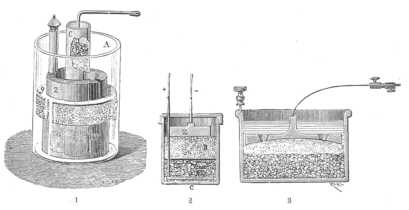 428. ábra. A telegrafiában használt oszlopok: 1. Siemens és Halske-féle oszlop; 2. Minotto oszlopa; 3. ugyanez az oszlop más alakban.
