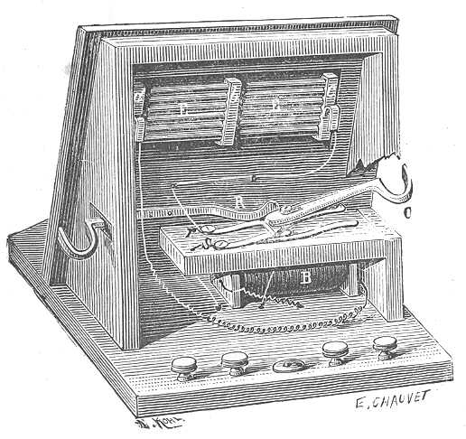 "A második rendszer, melyet a 457. ábra tüntet elő, egészen ugyanarra az elvre van alapítva. Áll pedig egy velezengő-szekrényből, mely hasonló a húros hangszerek velezengő szekrényéhez, vagy pedig egy egyszerű ebonit- vagy fenyűfa-asztalkából, mely az érintkeztetők egész sorával van ellátva. Ezek az érintkeztetők nikkelezett kicsiny szénhengerekből állanak, mely hengerek a szekrény egyik oldalára merőlegesen függő közös fémtengelyre vannak fűzve. Mozgásuk egymástól független, s mindegyikük