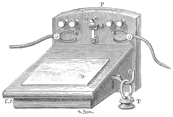 is szolgál; a csengetyűk ébresztő gombja M-nél van. A készülék a végből, hogy az átteendő hangokhoz nem tartozó rezgések vagy lökések visszatarttassanak vagy megsemmisíttessenek, ólomalapzaton nyugszik, a melyet megint kaucsuk-lábak tartanak. Később látni fogjuk, hogy az eme rendszerbeli áttevőket szinházi előadások hallgatására alkalmazzák. Az ily hallgató próbák 1881 őszén az elektromos kiállítás látogatóinak kíváncsiságát a legnagyobb mértékben felkeltették.