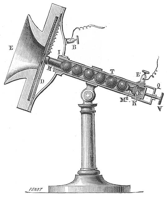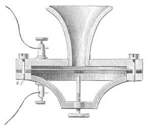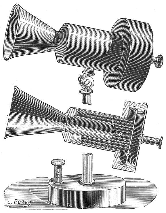 "A két rendszer elseje egy platinázott vagy nikkelezett rezgő lemezből áll, a melynek felületére nikkelezett csövekbe fűzött szénpálczák sora merőlegesen támaszkodik; ezek a csövek két átlyukasztott gyűrűben szabadon csúszhatnak s hosszúságaikat a széncsúcsok csak néhány milliméterrel haladják meg, tehát jó vezetők. A csöveket tartó két gyűrűn keresztül nyúlik egy középső cső, mely kívülről hangtölcsérben végződik s a melynek másik C vége a hártya közepe előtt torkollik."