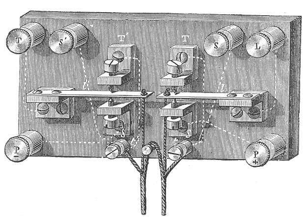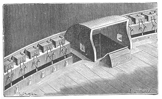 A súgólyuk mindkét oldalán, a korlát mentén, az operaház színpadával szemben tizenkét áttevő volt elhelyezve, mely áttevők mindegyikének megvolt a maga telepe és gerjesztő tekercse. (464. ábra). Az áttevőket a halló termek átvevőivel földalatti drótok kapcsolták össze; ezekhez az általános megjegyzésekhez mit sem kellene hozzátennünk, ha nem mutatkoznék szükségesnek, hogy kiterjeszkedjünk egynémely részletére azon óvó intézkedéseknek, melyek hivatva valának, hogy eme kivételes körülmények között a hallást a lehető legtökéletesebbé tegyék.