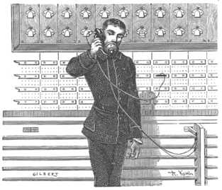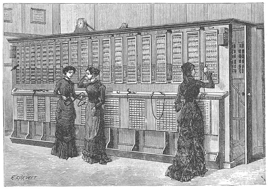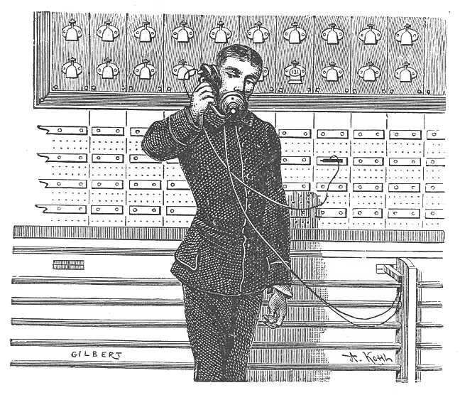 van látva az előfizetők rendbe szedett sorszámaival s ezeknek jelző lapocskáival, el vannak rendezve a kommutátorok, melyekkel akár két tetszés szerinti előfizető között, akár pedig a hivatal s egy előfizető között a kapcsolatot helyre lehet állítani. A megértett felhívás után egy tisztviselő a telefonja drótját egy rézrúdra akasztja, mely rúd megfelel az illető külön vonalnak s a beszélgetés megkezdődik. Az előfizető megnevezi ugyanannak a hivatalnak (vagy ugyanabban a városban lévő másik hivatalnak) azt az előfizetőjét, kivel összeköttetésbe kíván lépni. Az első esetben a tisztviselő megnyom egy gombot, mely megindítja a kívánt szám csengetyűjét, ezután a két számot egy dróttal összeköti, s ebben a pillanatban a két előfizető közötti közlekedés helyre van állítva. Midőn az összeköttetésbe hozandó előfizetők nem tartoznak ugyanahhoz a hivatalhoz, a kapcsolat az egyik hivataltól a másik hivatalhoz intézett közlemény alapján jön létre; most egygyel több közbenjáró van, de azért a közlekedés szintén igen könnyű.