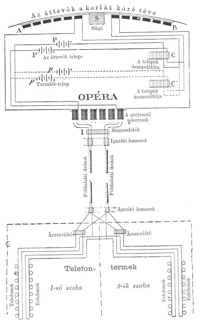 A telefonia, első föllépése idejében lelkesedésnek, sőt mondhatjuk, rajongásnak volt a tárgya, a mi mindannyiszor, midőn egy fontos s némileg váratlan felfedezés felkerűl, természetszerűleg nyilvánúl. Hirtelenében ezerféle, érdekesnél-érdekesebb alkalmazásnak homályos körvonalai tüntek fel. Néhányat azok közül, melyek jelenleg, legalább is a nagy városokban, mintegy bevett szokássá váltak, már felemlítettünk. Még csak néhány szót kell szólanunk azokról a kisérletekről, melyek egy másik irányban tétettek, hogy az első pillanatban föléledt remények egyikét megvadósítsák. Az ember avval kecsegtette magát, hogy e csodálatraméltó készülékek segítségével nemsokára mindenki a lakásán fog élvezhetni hangversenyeket, színházi előadásokat, hogy részt fog vehetni gyülekezetekben,