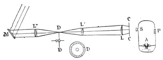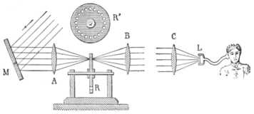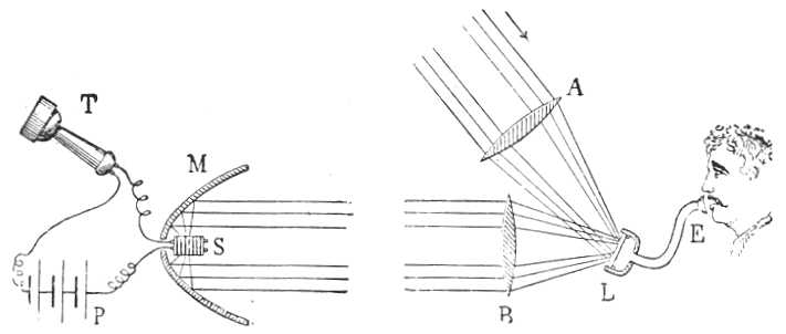 A 469. ábrában M egy síktükör, melynek felületére párhuzamos fénysugárnyalábot, mint a milyenek a napsugarak, vetünk. A nyalábot, miután visszavetődött, az L'' lencse fogja fel s gyujtó-pontjába, D-be gyűjti össze. A fénysugarak, miután ebben a pontban egymást keresztezték, egy ugyanakkorra gyujtótávolságú második lencsére esnek s újra párhuzamosakká lesznek. Egy harmadik lencse, L, a sugarakat a P telep telefonos áramkörébe igtatott S szelénlapra veti.