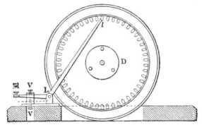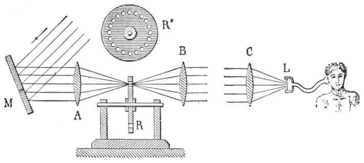 Hogy a szelén elektromos ellenállását megváltoztassuk, D pontba egy korongot teszünk, mely korong kerületén, miként a fenakisztikóp korongjain, bizonyos számú lyuk van vágva. A korong a lencsék tengelyére merőlegesen s úgy van állítva, hogy gyujtópontjuk a lyukak egyikével összeessék. Ha már most a korongot a tengelye körül többé-kevésbbé gyorsan forgatjuk, a fénynyaláb, valahányszor egy lyukra akad, tova fog terjedni, de midőn a korongnak két-két lyuka közötti teli közökre talál, melyek az útjába esnek, vissza lesz tartóztatva. Nyilvánvaló, hogy mentül nagyobb a lyukak száma s mentül nagyobb a koronggal közölt forgó mozgás sebessége, annál nagyobb lesz a fénynyaláb meg-megszakításainak száma is. Tegyük fel, hogy a lyukak száma 40 s a sebesség 25 fordulat másodperczenként: a fénynyaláb meg-megszakításainak száma ugyanebben az időközben 1000 lészen. A miből az következik, hogy a szelénlap vezetőképességében, s következőképen a telefonos áramkörben keringő áram erősségében is ugyanennyi változás jön létre, s már most a készülék rezgő lemeze is ugyanennyi rezgést fog tenni. Valóban az A hallgató zenei hangot fog hallani, mely hang magassága arányos lesz a korong forgás-sebességével.
