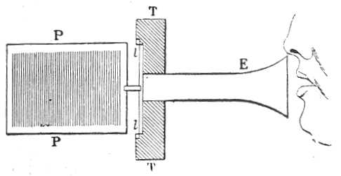 BELL a helyett, hogy a megszakgatott fénysugarakat szelénre vetítette volna, hatásukat vékony lemezek alakjában előállított igen sok más anyagon is kipróbálta; ez anyagok a következők valának: arany, ezüst, platina, vas, aczél, sárgaréz, réz, czink, ólom, antimon, új-ezüst, JENKIN-féle fém, BABITT-féle fém, elefántcsont, növényrost, gutta-percsa, ebonit, kaucsuk, papiros, pergament, fa, csillám és ezüstözött üveg. A 471. ábra a kisérlet berendezését mutatja. A hallgató a füléhez egy hallócsövet tartott, mely cső ahhoz a szekrényhez volt illesztve, melynek rezgője a megvizsgálandó vékony lemez volt. |