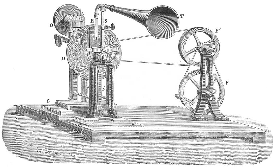 Az imént leírt fotofon, az igazat megvallva, nem hangrezgéseket visz ama rezgéseket tulajdonképen a fény idézi elő, a fény teremti meg a megszakgatásaival s ezeknek a szelén vezetőképességére gyakorolt hatásával. Azonban BELL megmutatta, hogy miként lehet a zenélő telefont, ebben az alakjában, jel-áttevőként használni. E végből a forgó korong