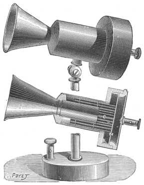a mágnes sarkai között, és pedig az egyik a másik meghosszabbítása mentén, vannak elhelyezve. Ezeket a lemezkéket bizonyos hosszúságra a telefonos áramkör tekercsei övezik körül; ugyanezek a lemezkék egy rézdarabbal vannak összekötve s a tekercsek közötti köztérben, a tekercsek fegyverzetének toldalékával majdnem érintkezve, egy kicsiny a lágyvas-fegyverzet van, melyet a t fa-göcs tart; maga a göcs a fenyőfa-lemez középpontjára van erősítve. Midőn az áttevő működik, a hullámzó áramok a mágnesben a mágnesi intenzitás változásait hozzák létre s ennek következtében a fegyverzetben rezgéseket, a sarktoldalékokkal valóságos ütődéseket hoznak létre. Eme behatás miatt a lemez hangrezgései igen erősekké válnak s a trombiták hangtölcsérein át szétáradva, a vadászkürt hangjainak harsogásával vetélkednek.* |