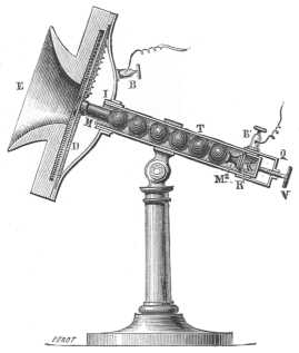 a cső hossza mentén csúszhatnak a nélkül, hogy oldalvást észrevehetőleg elmozdulhatnának; az egész tehát hat lánczolatos kapcsolatú érintkeztető. Az M1 rézhenger egyrészt az E telefonos hangtölcsérbe illesztett ebonitlemeznek, másrészt az első széngömbnek fekszik neki. A V csavarral, mely a K vájt rézdarabnak neki feszül, az M2 belül üres kicsiny réztömeget a cső utolsó gömbjéhez többé-kevésbbé erősen hozzá lehet szorítani s ily módon a készülék beigazítására szolgál az A telep s a telefon-áramkör drótjai a B és B' csavarokba kapcsolódnak; e csavarok az M1 és M2 tömegekkel fémies összeköttetésben vannak. A cső egy térdes lábra van szerelve, minélfogva, miként a távcsövet, minden lehető hajlással lehet állítani. A rezgések előidézte ellenállás-változások, miként a rugalmas golyókkal tenni szokott kisérletnél, valamennyi gömbbel egy pillanat alatt közlődnek. A feltaláló igen jó eredményeket nyert az által, hogy a gömböket higanynyal fémezte, miként ezt HUGHES a mikrofonja szeneivel tette. |
