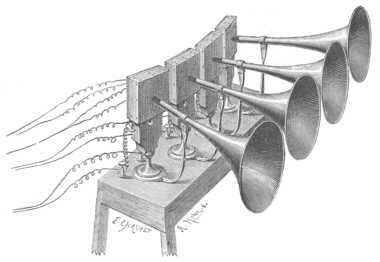 Szóljunk még néhány szót a mikrofonos eszközöknek a zeneművek reprodukálására való alkalmazásáról. Szólani fogunk pedig egy kombináczióról, melyet ADER az elektromos kiállításon valósított meg s a melynek segítségével a látogatók a Palais de l'Industrie mindegyik pontjában meghallgathattak vadászkar-négyeseket, melyeket négy énekes egy különös alakú áttevő előtt adott elő. A készülékek együttességét ADER trombitájának nevezték.
