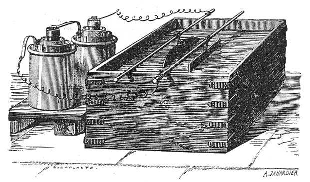 Hogy az elektromosság alkalmazásainak képét kiegészítsük, számot kell még adnunk azokról az alkalmazásokról, melyek az áram chemiai hatásaira, vagyis azokra a még rejtélyes tüneményekre vannak alapítva, melyeket a tudomány a dinamikai elektromosság egyik forrásaként is ismer.