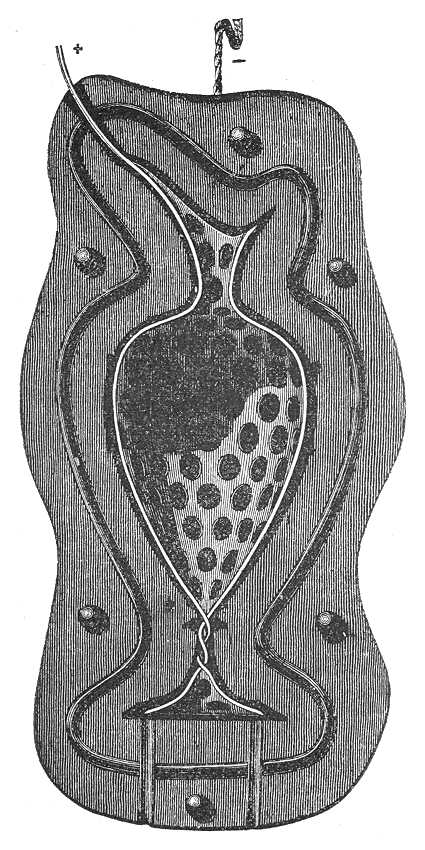 Az elv még mindig ugyanaz. Csakhogy a nagyméretű tárgyaknak lemásolása eleintén nehézségekbe ütközött, a melyeknek szerencsés elhárítása azonban sikerült. A fődolog az volt, hogy a forma különböző részeiben a lerakodmányok egyenetlen vastagsága mellőztessék, s hogy ugyanekkor mindenütt akkora legyen a vastagság, hogy a lemásolt műtárgynak elég nagy legyen a szilárdsága. Tegyük fel, hogy egy szoborformáról van szó, mely formának részei úgy vannak összeillesztve, hogy ugyanazt az űrt képezzék, a melyet a minta a formázás előtt betöltött. A kérdés már most az, hogy miként lehet valamennyi belső falon egyenlő és szabályszerű rézlerakodmányt nyerni. Eleintén olvadó pozitiv elektródot alkalmaztak, a melyet a forma belsejében helyeztek el; de az elektródok gyors olvadása csak egyenetlen s nem eléggé vastag lerakodmányt adott. LENOIR egy nem olvadó pozitiv elektródnak alkalmazását gondolta ki; ez az elektród platinadrótokból állott, a melyek a forma minden részét körülfutották, a nélkül hogy a formát érintették volna. Egy átlyukgatott