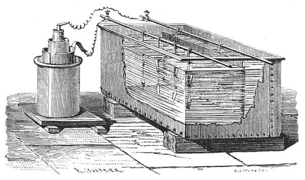 Először is hozzuk emlékezetbe azokat a tüneményeket, melyek akkor keletkeznek, a midőn az elektromos áram sóoldaton megy át. Például vegyünk kénsavas réz-oldatot. A mint az áramkör zárva van s az áram kering, a só azonnal szétbomlik: a pozitiv elektród körül oxigénbuborékok szállanak fel, a negatív elektródot alkotó lemezre pedig színréz rakodik le. A szétbontásnak eme tüneményét már azok a fizikusok is ismerték, kik csak az első VOLTA-oszlopokkal rendelkeztek, azonban az áram szabályszerűtlensége s rohamos elgyengülése miatt a lerakódott fém a legtöbb esetben csak porhanyó tömeg volt, a mely ipari czélokra nem volt alkalmazható. Mindazonáltal a tudományra nézve nem veszett kárba, s a chemikusoknak sikerült olyan fémeket is különválasztaniok s felfedezniök, melyek mindakkoráig ismeretlenek valának. Az állandó áramú telepeknek, mint például a DANIELL-félének feltalálása a tüneményt szerencsésen módosította. Fentebb már volt alkalmunk, hogy az első elektromos mótor feltalálásáról szóljunk, azéról, melyet JACOBI gondolt ki, hogy vele a Néván csónakot hajtson. Ha eme találmánynak nem volt is meg a szerzőjétől várt sikere, mégis alkalmat adott egy szerencsésebb találmányra, mely végtére a galvanoplasztikát szülte.