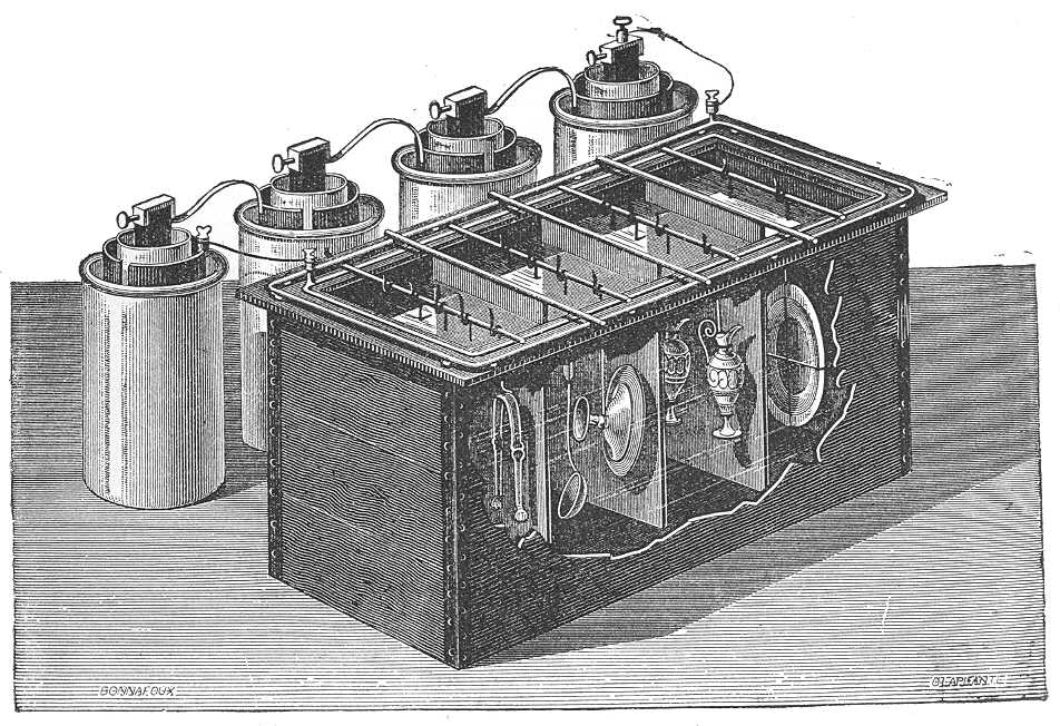 ban fürdött". Egy czinkhenger, mely a megaranyozandó tárgygyal ezüst-drót útján volt összekötve, létrehozta az elektromos áramot, melynek igen gyengének kellett lennie. Több tudós ELSNER, BÖTTGER, PERROT, SMÉE különbözőképen javította DE LA RIVE eljárását, de nemsokára egy új módszer, melyet az angol ELKINGTON (1840. szept.), s a franczia DE RUOLZ (1841.) majdnem egyidejűleg talált fel, az elektrochemia ezen új alkalmazásának hathatós lendületet adott. E pillanattól kezdve a galvanoplasztika CHRISTOFLE kezei között, ki a két feltaláló szabadalmát megszerezte, valódi művészeti iparrá vált.