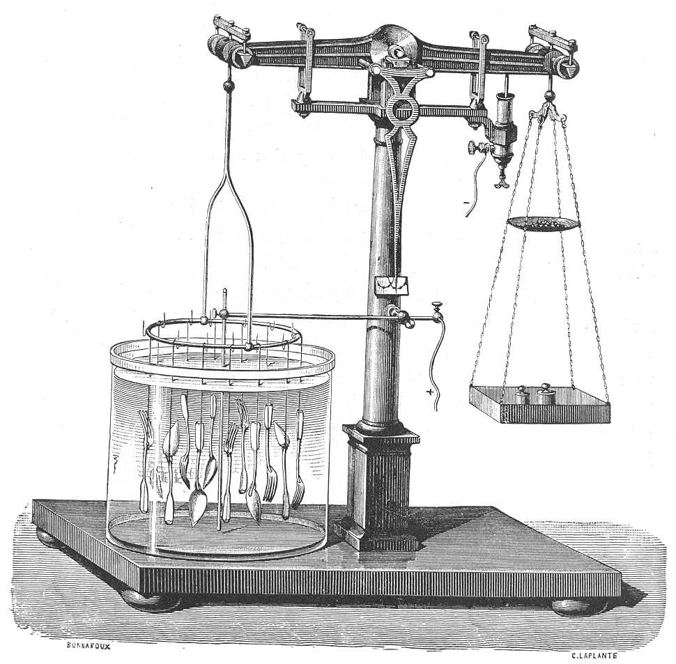 A baloldalon látjuk a készüléket, mely a mérlegrúd alá akként van helyezve, hogy az aranyozandó s ezüstözendő tárgyakat, midőn a fürdőbe merülnek, a mérlegrúd tartsa. Egy vízszintes lécz, mely a mérlegtartó oszlopra van erősítve, az egyik végén az olvadó pozitív elektródot tartja, a másik végével pedig a telep pozitív sarkával közlekedik. A másik mérlegkaron kettős csésze lóg: a felső csészébe tárasúlyt tesznek, mely az egyensúlyt létrehozva, a mérlegrudat vízszintes helyzetben tartja. Ebben a helyzetben az áram nem kering, ha ugyan feltesszük, hogy a negatív sarkot képező tárgyakat tartó léczek nem közlekednek az elektromos teleppel. De ha most a mérleg második csészéjébe azokat a meghatározott súlyokat tesszük, a melyek a bemerített tárgyakon való lerakodásra szánt nemes fémek súlyát képviselik, az egyensúly meg van zavarva, s a mérlegrúd a jobboldalon lehajlik. Azonban egy fémcsúcs, melylyel a mérlegrúd fel van szerelve, higanynyal megtöltött s az elektromos telep negativ sarkával közlekedő csészikébe merül, minélfogva az áramkör zárva van s a művelet megkezdődik.