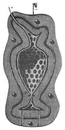 Midőn a forma már készen van, s a fémlerakodmány felvételére is alkalmassá van téve, a fürdőt s a galvanoplasztikai készüléket kell rendbe hozni. Az, a mit egyszerű készüléknek neveznek, nem egyéb mint maga a fürdő, mely lényegében véve nem egyéb, mint egy állandó áramú elem, mint a milyen például a DANIELL-féle. Tegyük fel, hogy valamely tárgyat rézzel kell lemásolni; ezt a fémet használják a legtöbb esetben. Egy üvegkádba vagy üvegedénybe vízben feloldott kénsavas rezet (mely anyag a kereskedésben kékgálicz név alatt ismeretes) öntünk; a kád közepébe egy likacsos hengert teszünk, mely henger maga is kénsavval megsavanyított vízzel van megtöltve, s a melybe egy czinklemezt vagy czinkhengert mártunk; ez a czink képezi az elem negativ sarkát. A lemásolandó tárgy formáját erre a sarkra egy fémdróttal úgy függesztjük fel, hogy a drót a vezető réteggel (grafit vagy kénezüst) érintkezésben legyen. Az 552. ábrából kitűnik, hogy miként van a készülék összeállítva, a mely különben galvános aranyozásra és ezüstözésre is használható. Ez esetben a fürdő minősége más lesz, miként ezt nemsokára látni fogjuk. |