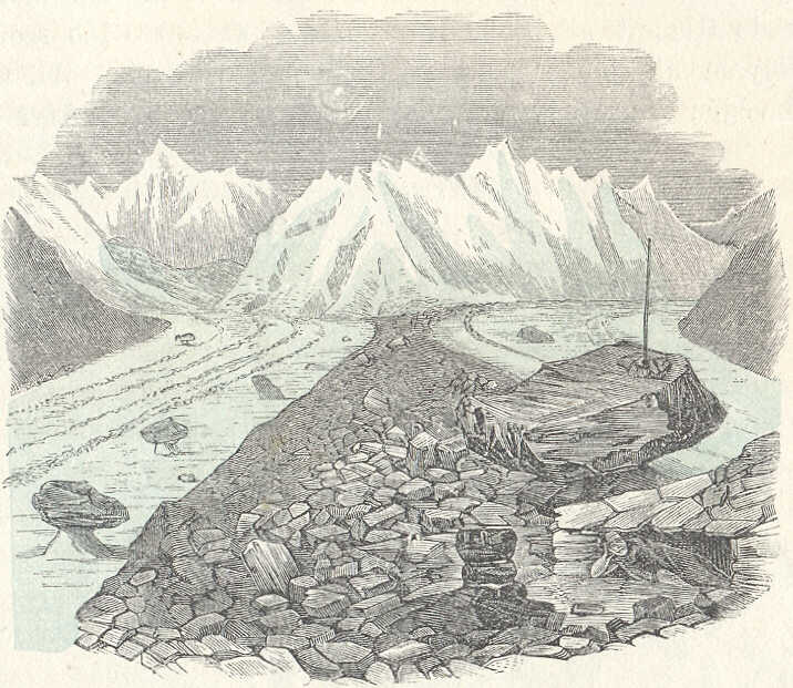 alsó fele évenként 400 sőt 600 lábbal tolódik el: úgy érteni fogjuk, miszerint ez eltolódásoknak minden lassuságnk daczára, még a jégárak hasadékainak s kőtorlaszainak tömkelegében is, előbb-utóbb fel kellett ismertetniök. A kövek mellett egyéb véletlenül a jégárra jutott tárgyak is tova hordatnak. Az 1788-ik év folyamában Saussure, a híres genfi természetbuvár, fiával és egy vezetők és hordárokból összeállitott karavánnal a Col du Géant magaslatán tizenhat napot töltött. Lejövetük alkalmával a Glacier du Géant