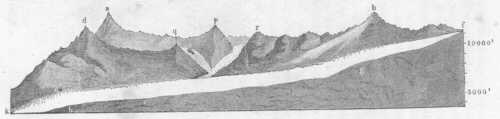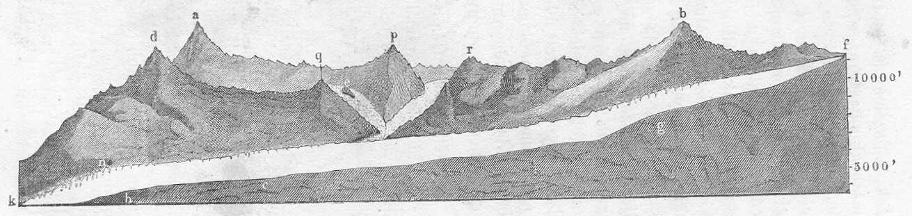 A jégár hajlását és esését a 15-ik ábra tünteti elő, mely annak hosszmetszetét Forbes méréseinek alapján mutatja. Ábránkon a jégár jobboldali partjának látképe terül el. A betük ugyanazon pontokat jelelik, mint a 14-ik ábrában; p az Aiguille de Léchaud, q az Aiguille Noire, r a Mont Tacul, f a Col du Géant helyzetére vonatkozik. Az utoljára nevezett Col du Géant a legmélyebb pont azon sziklafalak gyürűjében, melyek a Mer de Glace-t tápláló hómezőket körülveszik.