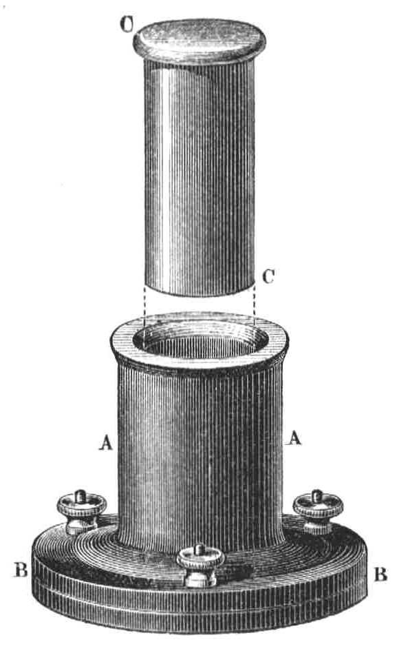 Kellő nyomás alkalmazása mellett a hónak jéggé alakitását mesterségesen is eszközölhetjük. Egy henger alakú öntött vas edény (AA) áll itt előttünk (22-ik ábra); fenéklapja (EB) három csavarral van leerősitve, úgy, hogy azt akkor leemelhetjuk, midőn az