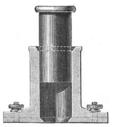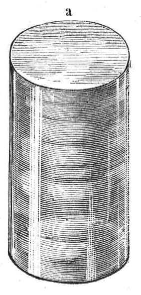 A jég engedékenységének még döntőbb próbája az lesz, ha a mintában formált hengerek egyikét szűk nyiláson préseljük át. E czélból a már előbb leírt henger alakú mintára egy fenéklapot erősitek, melybe kúpmódjára szűkülő, s a hengeralakú üreg átmérőjének kétharmadával egyenlő nyilás fúratott. (A 25-ik ábra az egésznek átmetszetét mutatja.)