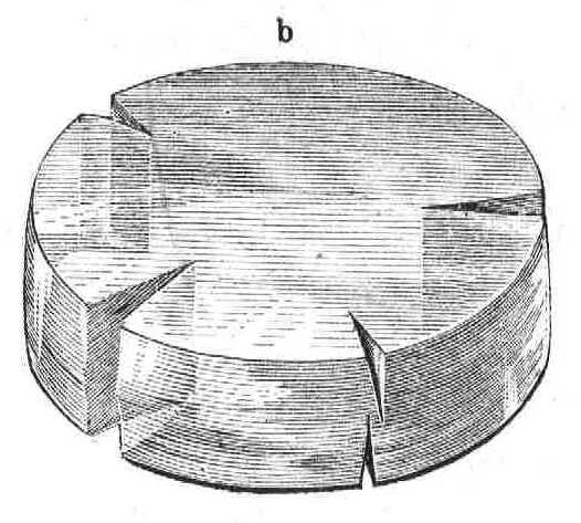 A préselő lapok közé legelőbb is egy durván faragott, hengeralakú, természetes jégdarabot fogok helyezni, mely a folyam felületéről metszetett ki, s két sík határlappal lett ellátva. Most a prést megszoritom; a jégoszlop a nyomás folytán széttörik; minden szakadás, mely keletkezik, az oszlop egész vastagságát átfutja, s az nagyobb töredékek halmazára bomlik, melyek még jobban széthullanak, ha a prést tovább szoritom. Ha megszüntetem a nyomást, úgy jóllehet a jégtöredékek összefagyás által ismét a szabálytalan lemeznek egy nemévé egyesültek, mégis félreismerhetetlen jeleit fedezzük fel annak, hogy az új alak nem anynyira a jégtömb engedékenysége, mint inkább széttöretése folytán jött létre, s hogy az egyes töredékek egymás iránti helyzetüket egészen megváltoztatták.