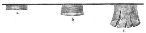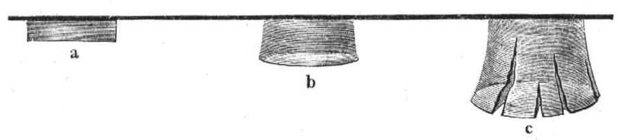 Ha most a mintába az előbb abban összepréselt hengerek egyikét helyezem, s a dugattyút leszoritom, úgy a jég a fenék szűkebb nyilásán átfurakodni kényszerűl. Eleinte a nyilás átmérőjével egyenlő átmérőjű, tömött henger gyanánt látjuk azt kinyomúlni. Mivel azonban a jég a nyilás közepén gyorsabban tolul előre, mint a szélein, azért a henger szabad végfelülete csakhamar domborodni, végső része pedig vastagodni fog, annyira, hogy azt a nyiláson többé vissza nem húzhatjuk, utóvégre is meg fog az hasadni. A 26-ik ábrán a, b, és c azon alakok sorozatát mutatják, melyek ily módon jönnek létre.