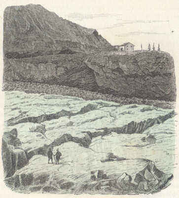 Chamouni látogatói közül legtöbben megelégesznek azzal, ha a Mer de Glace alsó részére léptek. Rendesen a montanverti kocsmánál (m) lépnek reá, s a szédelgéstől mentek a jégárt keresztben átszelik, hogy a (Chapeau (n) szembenfekvő házikójához jussanak. Bár ez úton, mint ábránk is mutatja, a jégárnak aránylag csak nagyon kicsiny része tárul fel szemeink előtt: mégis kielégitő képét adja az mind ama nagyszerű jeleneteknek, mind ama fáradalmak és nehézségeknek, melyek a jégárak között a vándorra várnak. Merészebb utasok a jégáron egész a csekély növényzettel bontott Jardin (e) nevű kőszirtig hatolnak, mely a Glacier du Talèfre jégáramát kétfelé bontja. Mások még bátrabban Col du Géant-ig (11000 láb a tenger szine felett) emelkednek, s onnét az olasz oldalra, Aosta völgyébe mennek.