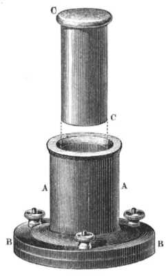 edényben képzett jéghengereket kiakarjuk szedni. Az edényt, miután az jeges vizben nulla fokig lehűttetett, hóval tömjük tele, s aztán belső üregébe vizsajtó segélyével a CC dugattyút toljuk, mely azt teljesen kitölti ugyan, de abban mégis könnyen ide-oda csúszhat. A vizsajtó alkalmazása lehetségessé teszi, hogy a hóra gyakorolt nyomás ötven légköri nyomással felérjen. A laza hó ily hatalmas nyomás alatt természetesen nagyon kis térfogatra szorúl. Ez első művelet után megszüntetjük a nyomást, kiemeljük a dugattyút s a henger üres részét újra hoval töltvén meg, újra összenyomjuk, s igy folytaljnk e műveletet mindaddig, mig az egész minta jéggel telt meg, mely a nyomásnak többé nem enged. Ha most az összepréselt havat kiveszem, úgy látni fogjuk, hogy az egy egészen kemény, éles szögletű s gyengén áttetsző jéghengerré vált. Mennyire kemény e tömeg, arról önök is meggyőződhetnek a roppanás által, melyet akkor hallanak, midőn azt a talapzatra hajitom.