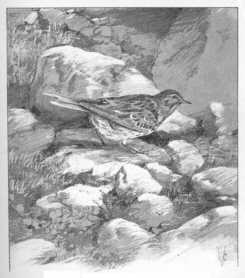 valami pityér Anthus ; a kis madár felkelt és eltűnt; a fészekben hat tojás láthatóan megkotolva. Lesre fogtuk a dolgot; tíz percz múlva már jött az anyamadár s úgy 15 lépésnyire, háttal felém, leült egy száraz ágra, kicsit igazgatva tollán. Le kellett lőni, le is lőttem s a mint fölveszem, felém kaczag a rőt begy és torok; rátaláltam tehát itt a húsz évvel azelőtt Gyekén szerzett ismerősömre az Anthus cervinus-ra (24. kép), melyet valamikor Nubiába, Egyiptomba küldözgettek a kontinentális madarászok s a melynek itteni fészke-