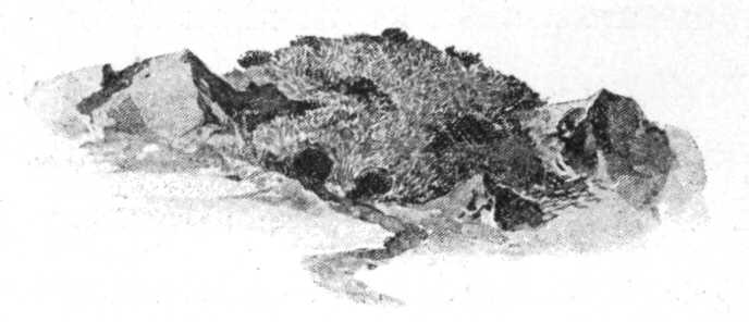 Egy köves, mohos helyen azután föltűnt a lemmingnek egy igen tágas bejárója (30. kép), mely kettős csőnek volt a kapuja; majd egy páros bejáró, a melyhez valóságos és a mint gondoltam friss lemming-ösvény vezetett; erre reáirányoztam a vadász figyelmét, mire a fejét rázta. A mint azonban látja, hogy nem győzött meg, odaszagoltatott az ebbel, a mely nem jelezett. És minthogy még evvel sem voltam megelégedve, a vadász térdre bocsátkozott, benyúlt mutató újjával a lyukba s valami hurokkötő pók sűrű hálózatát vonta ki onnan, világos jeléül annak, hogy oda mostanság nem