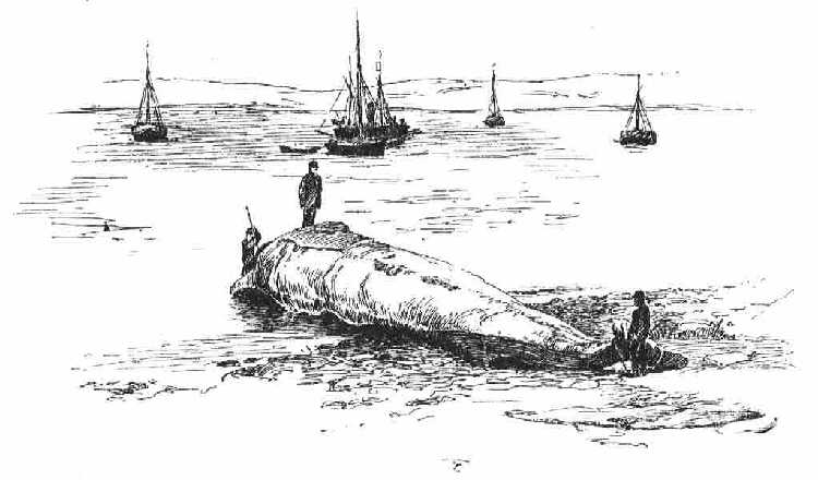 Ekkor már tisztában voltam, mik legyenek azok a rovátkos halmok? Nem voltak azok egyebek, mint az agyonlőtt s még le nem szalonnázott, részben rovátkos bálnák puffadt, a vízből kiálló, óriási potrohai; a parton heverő nagy test egy leszalonnázás alatt álló bálna; a tenger fölszínén úszó valamik pedig a leszalonnázott bálnák tetemei voltak, a melyekből a csontok ki voltak szedve. Azok a sajátságos fehér